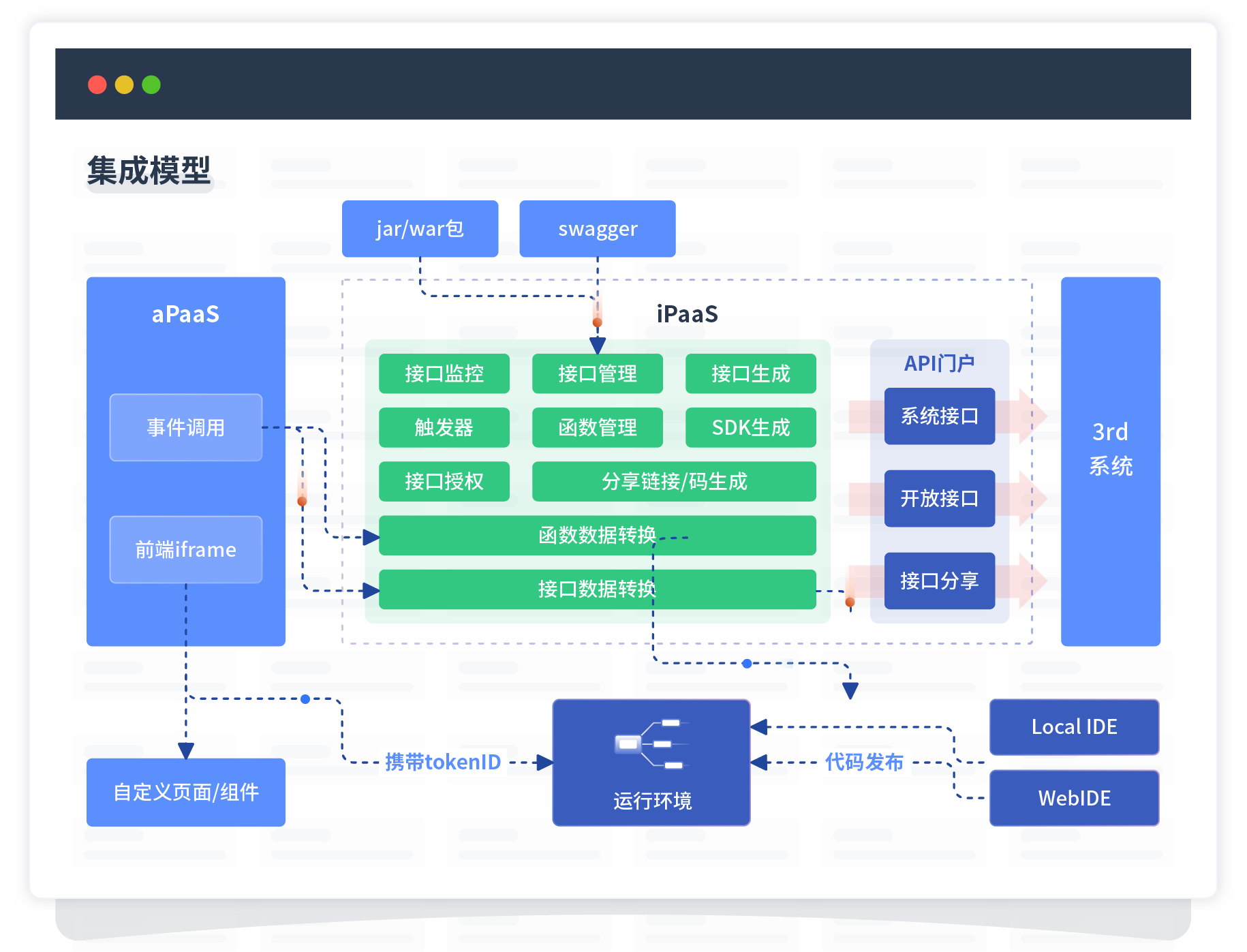 集成模型包括平台本身前、、、、后端能力的扩展,,也支持通过API门户和第三方系统进行交互。。