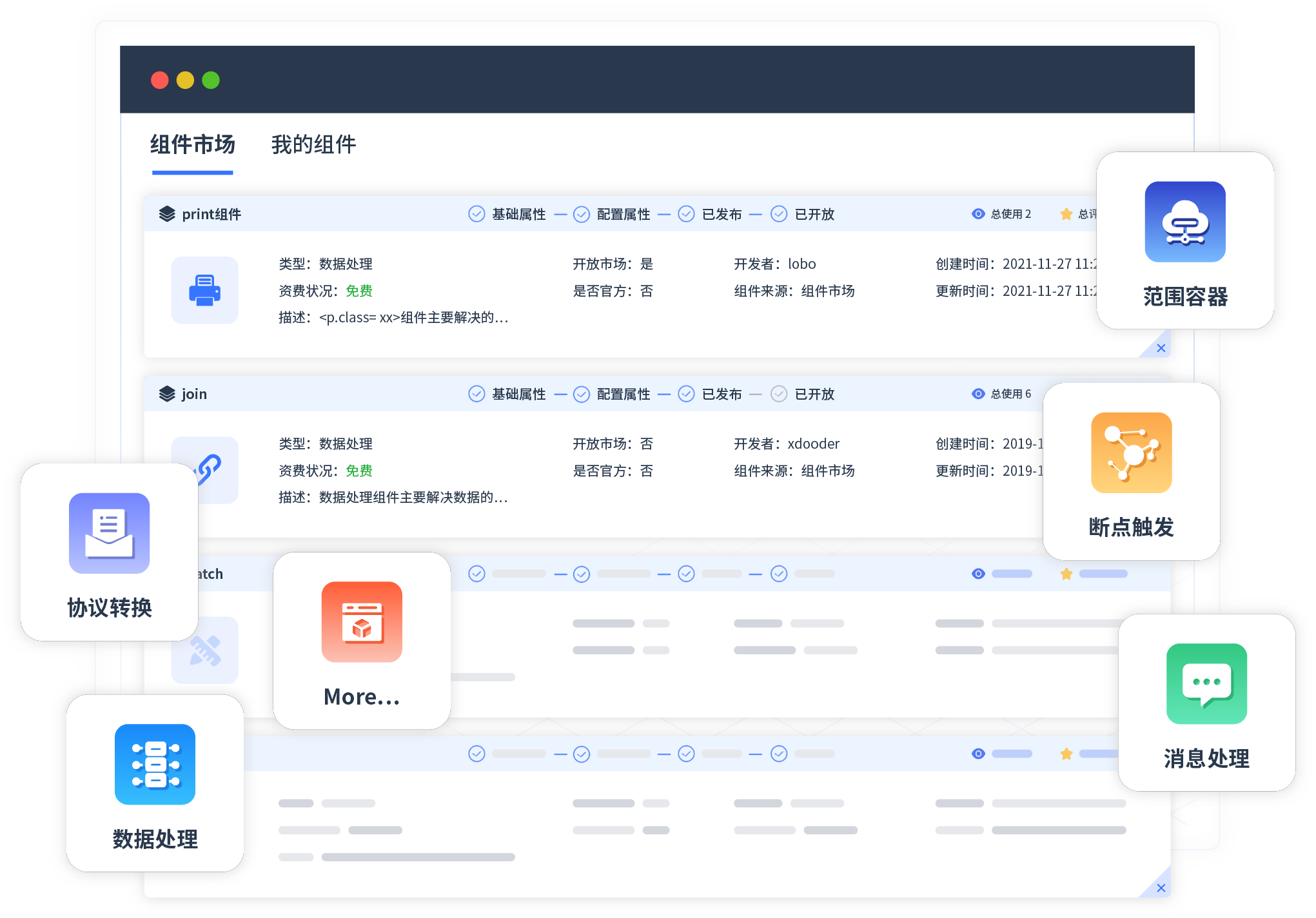 针对集成场景,,钱能钱包提供组件市场,,,例如协议转换、、、消息处理、、、文件操作等。。。除平台提供的组件外,,客户可以自定义所需组件。。