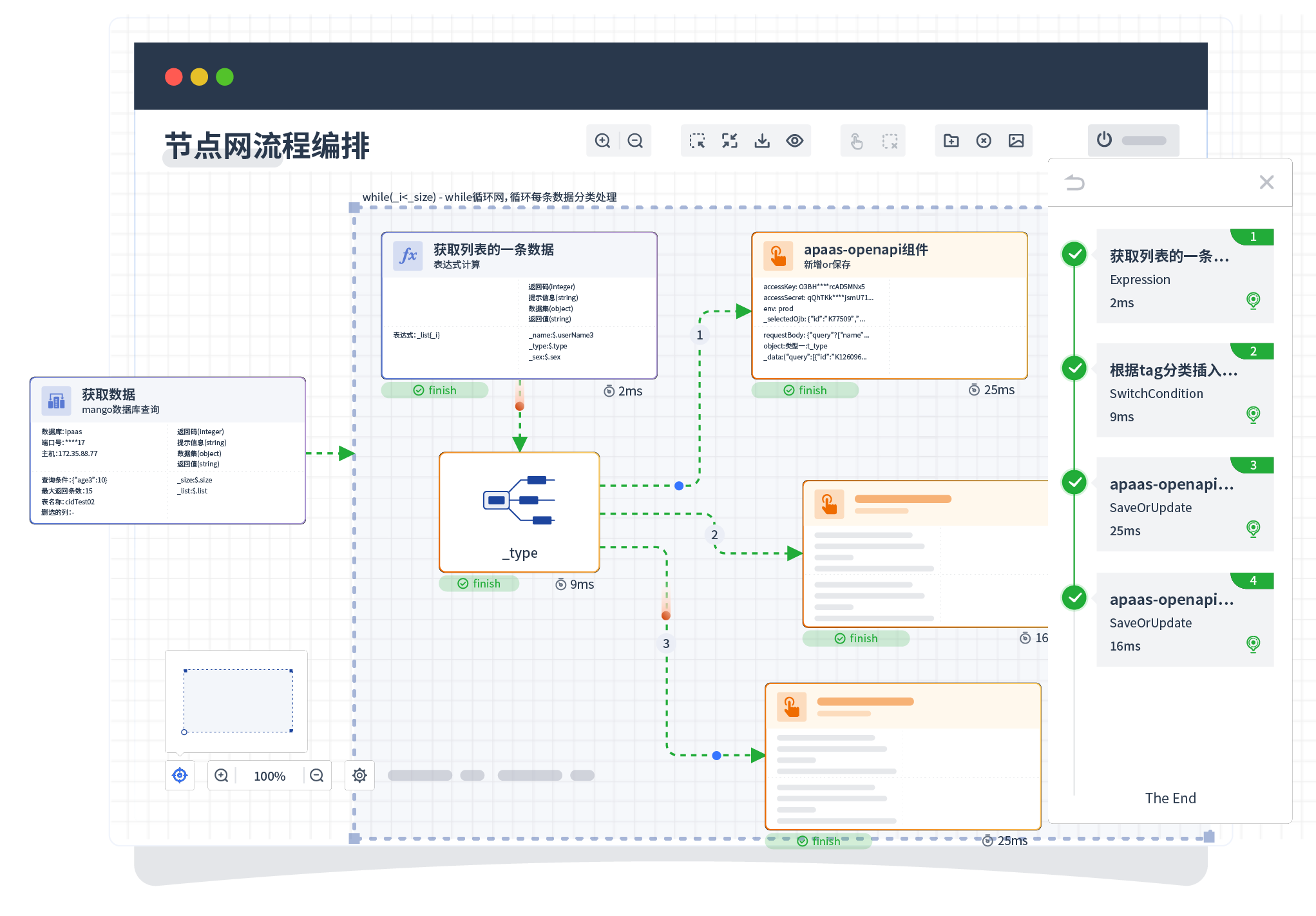 针对集成场景,,,,组件定义后支持进行流程编制,,,,不同于传统代码方式,,,,通过图形化展示,,,,支持在线调试、、、、日志查看和运行回放。。。